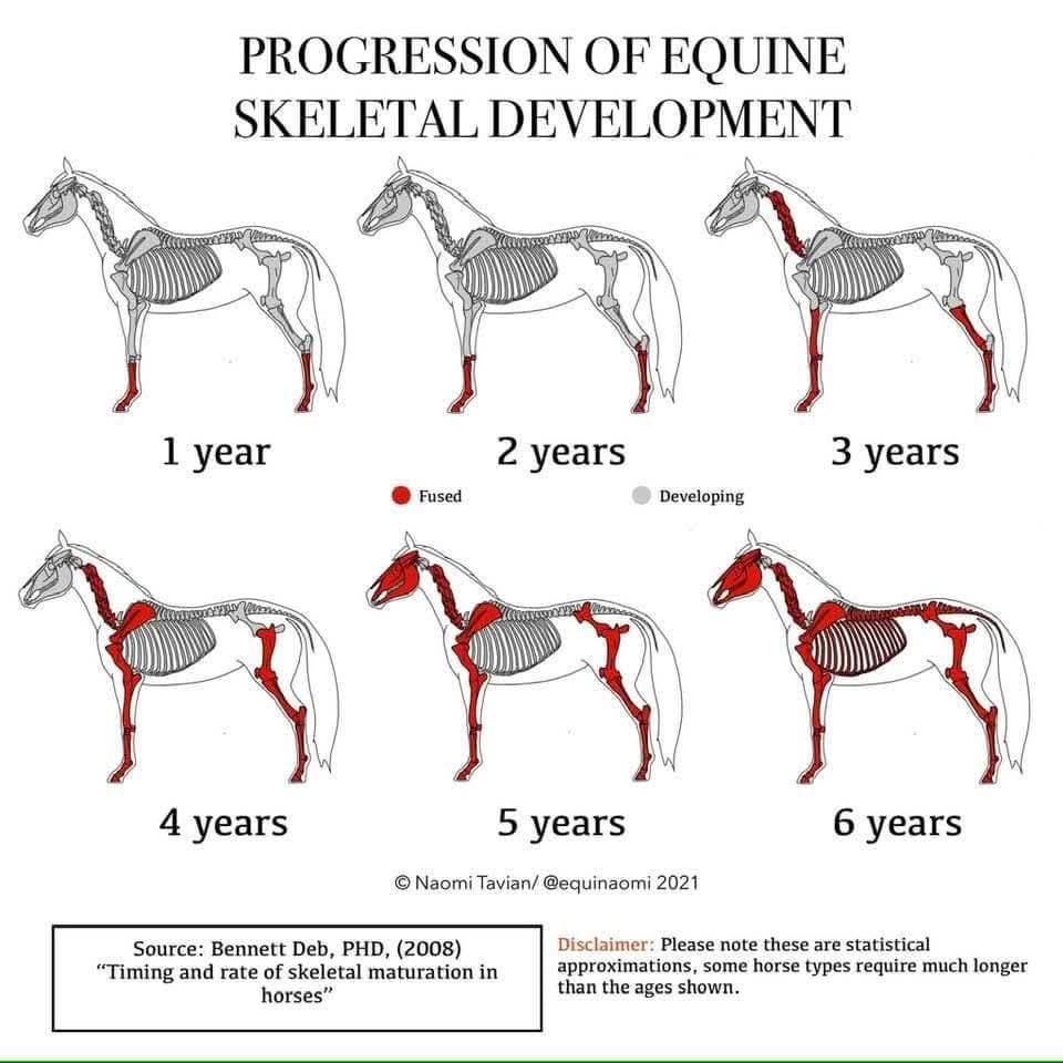 Mladý kůň není hotový kůň. Kostra dozrává dlouho. Velmi dlouho. Růstové ploténky v končetinách se sice uzavírají relativně brzy, ale páteř, především hrudní a bederní oblast, dozrává klidně až kolem šesti, někdy i sedmi let. A to nemluvím o hlubokých stabilizačních strukturách, které se formují teprve postupně skrze přirozený pohyb a správné postupné ježdění.
